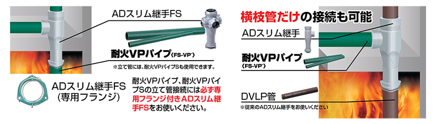 高層階までご対応。耐火プラAD 継手の各種性能を大幅リニューアルした「耐火プラAD 継手HG・SG」は立て管・横枝管にVP 管の接続も可能です。※