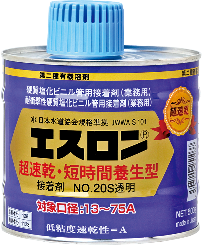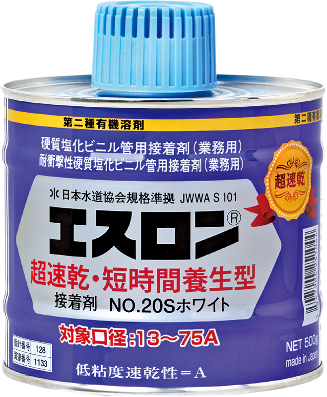 エスロン接着剤は、各種エスロンパイプの材料・性能に適した接着剤を揃えています。ゴム輪接合用の滑剤ベルソープ、各種接合剤もとり揃えています。
