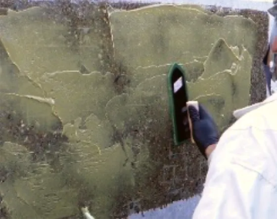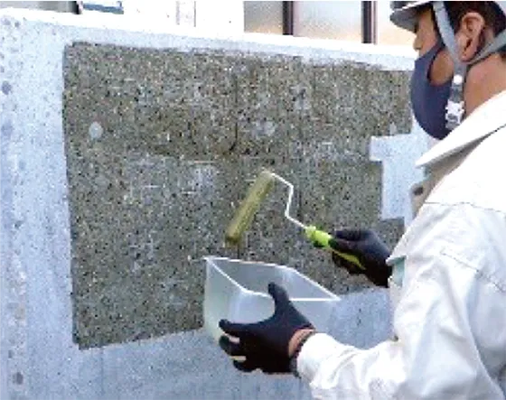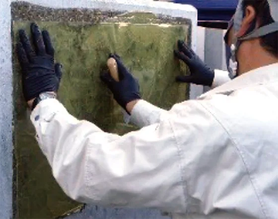 あらかじめ工場で太陽光・紫外線で固まる樹脂をガラス繊維に含浸させた紫外線硬化型FRPシートなので、早く、簡単に均一な貼付けが可能になります。