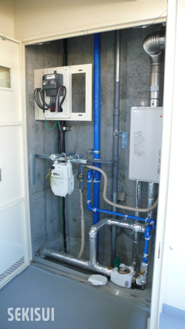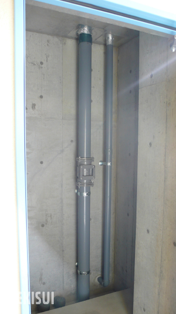 給水とガス、電気のシャフトBOXとは別に倉庫を兼ねた排水管用シャフトBOXがあって、その中にVPの立て管があり、各階床貫通部に耐火プラAD継手を使用しています。