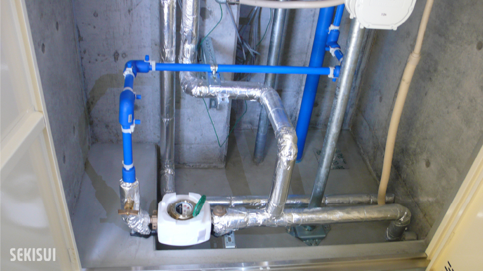 現在使用されている建物給水管の中で、住戸内配管は架橋ポリエチレン管(エスロペックス)、水道本管、敷地内埋設管、給水横主管は高性能ポリエチレン管(エスロハイパーAW)を使用しておりますが、防火区画貫通に関する法規制や長年の実績などから金属管が多く使用されております。エスロハイパーAWは建物給水管として開発・実用化を検討するに当たっては「独立行政法人都市再生機構」様と「建築設備用ポリエチレンパイプシステム研究会」との共同研究として、様々な実験検証を行なってまいりました。