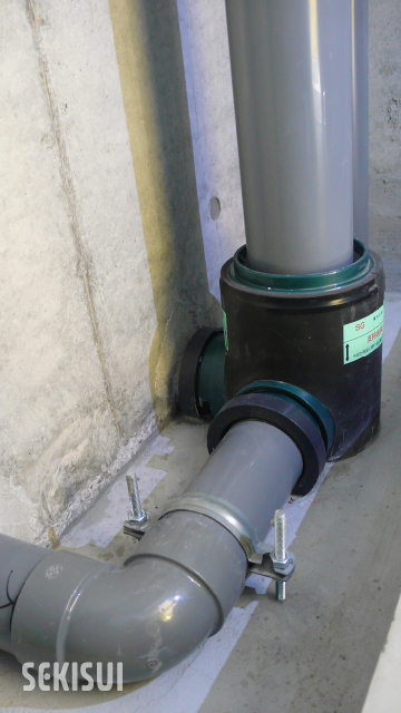 耐火プラAD継手SGなら、コストパフォーマンスの良いグレーのVP管を立て管や部屋内の配管に使うことができ、排水設備のイニシャルコストとランニングコスト抑制のお役に立てたものと思っております。