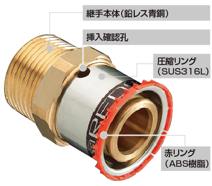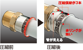 継手圧縮後は、外観(色)の変化を目視で確認しやすいため、水圧試験を実施する前に、圧縮締め忘れの発見が容易になります。