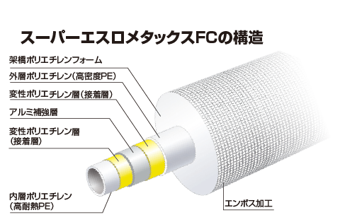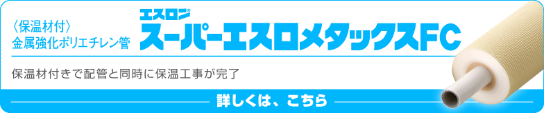 プラスチックと金属管のメリットを併せ持つスーパーエスロメタックスに保温材を巻き付けたパイプです。内層には高耐熱ポリエチレン樹脂、外層には高密度ポリエチレンを採用し腐食の心配がありません。また、アルミ補強層により施工時に管の曲げ加工をおこなった形状を保持する事が可能に!