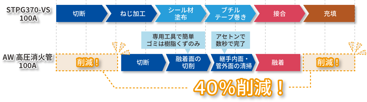 施工費で約40%ダウンになるのは、鋼管と樹脂管では施工手順に違いがあるため、その分施工が早くなることによります。